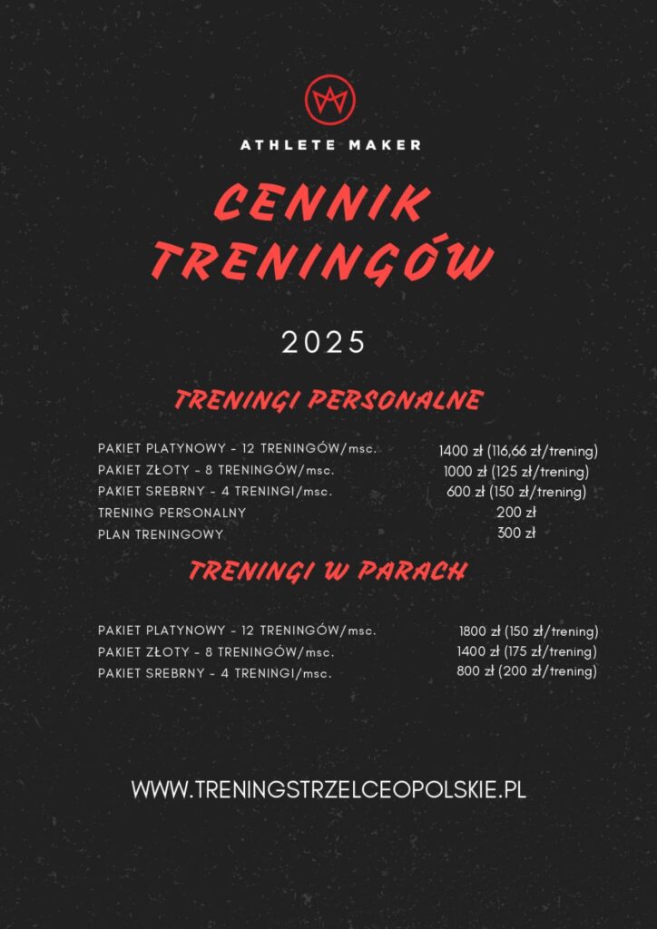 CENNIK Poniżej znajdziesz cennik moich usług, aby dowiedzieć się więcej skontaktuj się ze mną. TRENING W PARACH Trening dla dwóch osób od 150zł/trening TRENING PERSONALNY Trening personalny 1 na 1 od 116,66zł/trening PLAN TRENINGOWY Indywidualny plan treningowy na 6 tygodni od 300pln